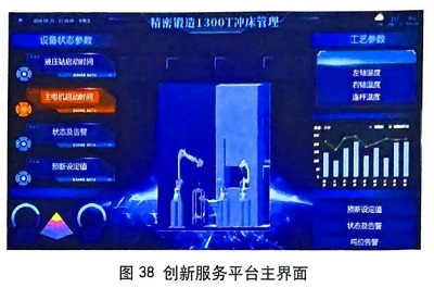 以智能化鍛造生產(chǎn)閉環(huán)線為核心,基于鍛件的工藝、生產(chǎn)過(guò)程、在線監(jiān)測(cè)數(shù)據(jù)、銷售數(shù)據(jù)和使用過(guò)程等,與人工智能生產(chǎn)技術(shù)相融合,開(kāi)發(fā)一套智能化鍛造服務(wù)平臺(tái)。平臺(tái)具有鍛件產(chǎn)品質(zhì)量監(jiān)督、智能工藝設(shè)計(jì)、自動(dòng)控制調(diào)節(jié)設(shè)備參數(shù)、自動(dòng)調(diào)節(jié)生產(chǎn)頻率等功能。通過(guò)圖36所示熱模鍛數(shù)據(jù)服務(wù)創(chuàng)新服務(wù)平臺(tái)顯示系統(tǒng)呈現(xiàn),實(shí)現(xiàn)狀態(tài)感知、實(shí)時(shí)分析、精準(zhǔn)執(zhí)行及自主決策。