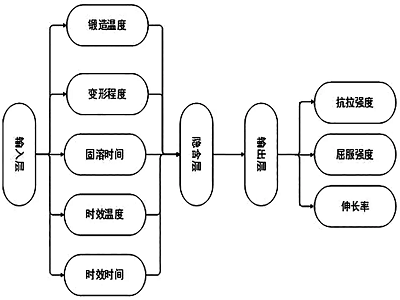 構(gòu)建的神經(jīng)網(wǎng)絡(luò)模型采用三層結(jié)構(gòu),即輸入層、隱含層和輸出層。模型結(jié)構(gòu)如圖33所示,輸入層的參數(shù)分別是鍛造溫度、變形程度、固溶時(shí)間、時(shí)效溫度、時(shí)效時(shí)間,輸出層的參數(shù)為抗拉強(qiáng)度、屈服強(qiáng)度、伸長(zhǎng)率。