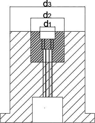 根據(jù)仿真結(jié)果開(kāi)展模具設(shè)計(jì),具體分為凸模設(shè)計(jì)、凹模設(shè)計(jì)(圖11)及模具裝配(圖12)。凹模內(nèi)壁承受的單位應(yīng)力很高,因此采用兩層組合凹模的方法。組合凹模材料選用45號(hào)鋼,可以顯著提高凹模承載能力,防止模具縱向開(kāi)裂。