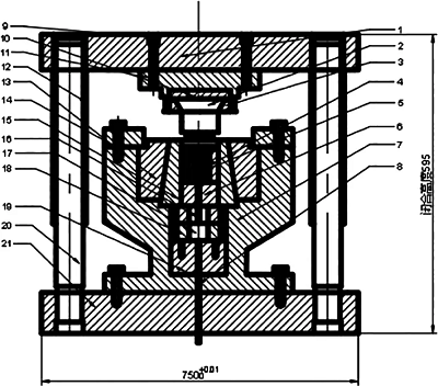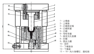 鐘形罩?jǐn)D壓成形需要四套模具,各擠壓步驟模具結(jié)構(gòu)除凸凹模外基本相同。反擠壓是保證零件的尺寸精度和表面粗糙度的關(guān)鍵,擠壓時(shí)模具要承受一定的高壓,所以對(duì)反擠壓模具要求較高,設(shè)計(jì)圖如圖14所示。
